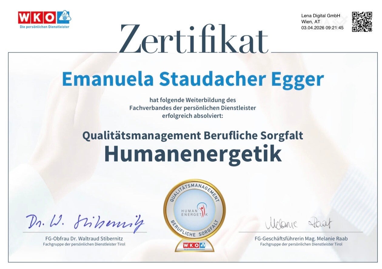 Die Humanenergetik Ausbildung ist das Herzstück meiner Qualifikation. Sie bildet die Grundlage für mein tiefes Verständnis der energetischen Zusammenhänge im Körper und ermöglicht es mir, Sie umfassend auf Ihrem Weg zu Balance und Wohlbefinden zu begleiten. Dieses Zertifikat steht für mein Engagement in der ganzheitlichen Praxis.